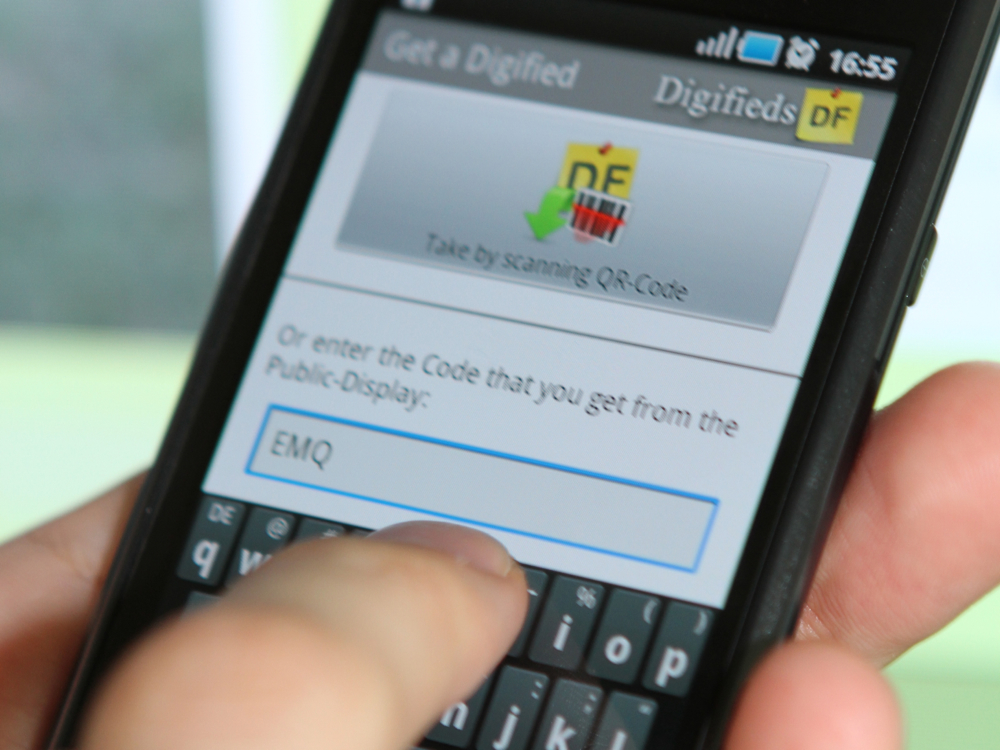 The Digified’s system architecture consists of a client-server infrastructure that allows an arbitrary number of display and mobile clients to be connected (see Figure 8). The Digifieds server as the central component of the system is responsible for data management and storage. As data and configurations are stored centrally, the exchange of content between clients as well as the replication (e.g., same content on multiple displays in the same neighborhood) is easily feasible. Access to the different clients is provided through a RESTful API. The core component of the system is the Digifieds server, which stores and maintains the content. It requires the open source Glassfish application server, sufficient storage, and requires a permanent connection to the Internet. In addition, different devices can be used as clients, including displays, phones, or laptops. The Digifieds display client – a web application that renders the content and provides means to add and retrieve arbitrary classifieds – can be accessed through any browser simply by calling a specific URL. To allow classified ads to be directly created at the display, a touch-enabled surface is required so that the users can enter information via an onscreen keyboard. As an alternative, content can be accessed also from any personal computer through the Digifieds web site where the alphanumeric code associated with each classified ad can be entered. To support easy content transfer to and from a public display as well as to create content on-the-go, the system provides the Digifieds mobile client – an Android app that is available from Google Play or a URL shown on the display. An Android phone is required for installing the client. Optionally, the camera of the mobile phone can be used to embed photos and videos into the post as well as to exchange content with the display via QR codes (retrieving content is either using a native QR code reader or the QR code reader integrated with the application).
