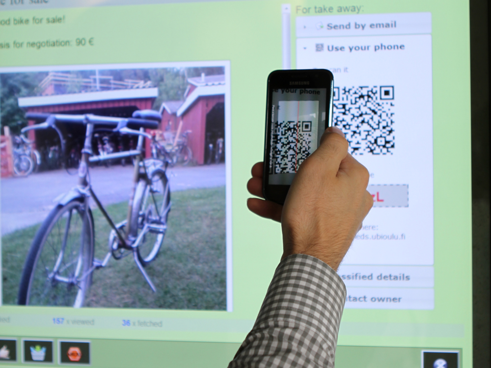 Digifieds was deployed on the same hardware as FunSquare as described in sections 1.3 and 3.1. The original version of the Digifieds application includes the previously mentioned phone-display touch feature. This feature allows content to be exchanged with the display by hitting the desired location on the screen. Unfortunately, plans to explore this technique in the wild had to be dropped because the display hardware in Oulu used capacitive touch screens, which made it impossible to detect touches from a mobile phone. Furthermore, we discovered that Nokia is still quite popular in Finland, which excluded users that did not own an Android smart phone. This led to less use of the mobile client than we had expected, as people mostly owned phones running Symbian, and more recently Windows Mobile.
